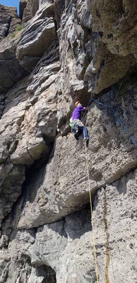 We finished off with Megalopolis, E1, which takes an overhanging corner / crack and roof. I improvised and climbed diagonally directly up the barnacled wall to try to avoid the worst of the wetness in the crack, but almost came undone as this also neatly avoided most of the gear! Mildly harrowing.