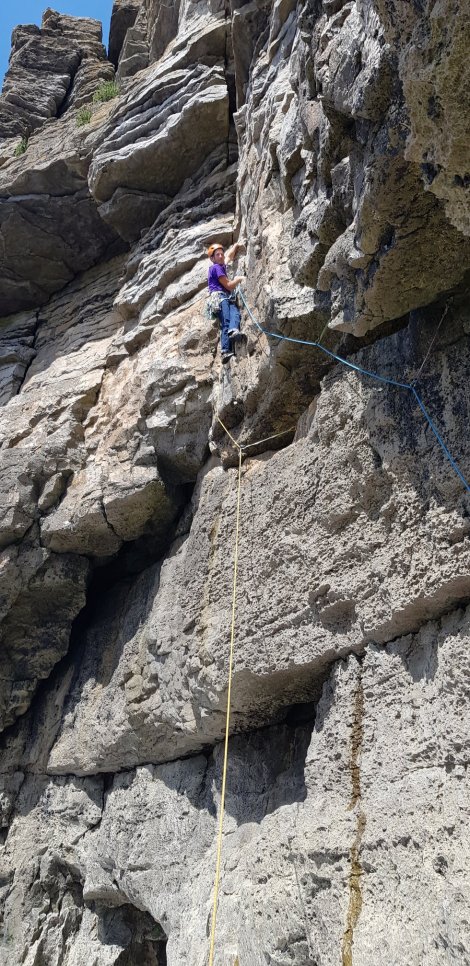 This major HVS outing is almost 100m along a break around 2/3 height and starts with a 20ft down-climb to reach the least rubbly level. It’s described in 7 pitches, and even with careful ropework and lots of long slings it’s hard to cut down much as the cliff zigs and zags.