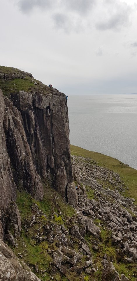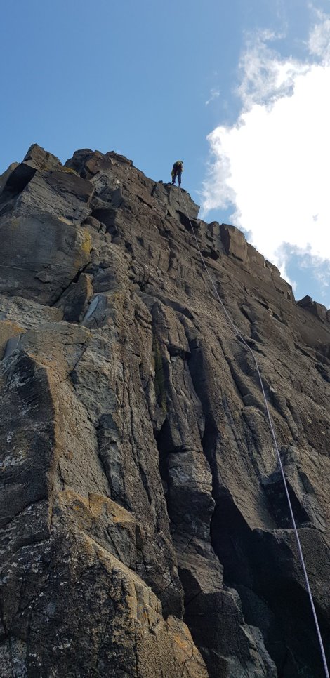 We scooted around to the southern end of the tower to do Wish You Were Here, E2 and given the 4* treatment in the Latter guide. This is a soaring thin crack in the back of a shallow groove – the crack provides plenty of gear but not much in the way of holds, but there are sufficient knobbles and crimps either side to allow steady progress – never really desperate but continuously interesting. Recommended! Just caught this shot of the guy belaying at the top of the next route, gazing out at the Western Isles, thinking: “Wish you were here?”