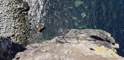 This is a very handy south facing wall (on an otherwise west-facing cliff) in a fairly sheltered bay. We did a couple of routes on the sunny seaward wall to the left of the photo above: Tinderbox, HVS (tough for the grade) and Side Step, VS. Both very worthwhile.