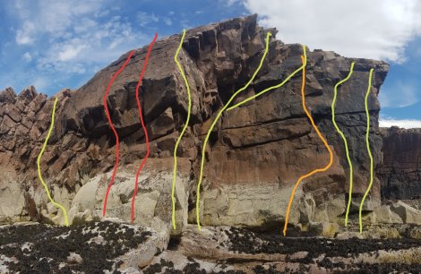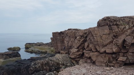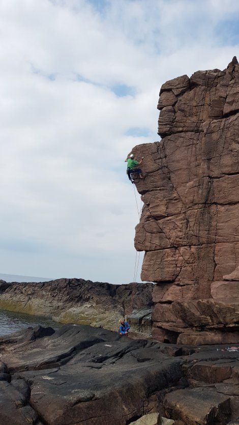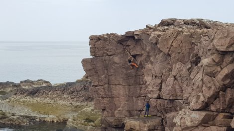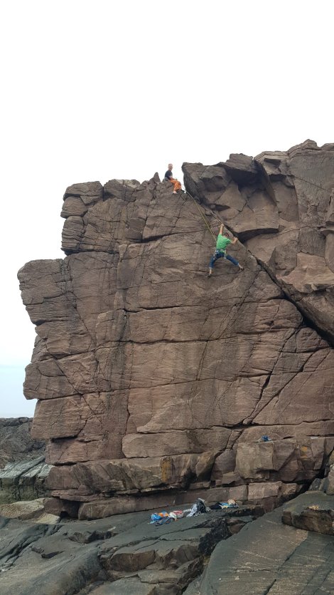 There are hundreds of routes scattered along the seacliffs around the tiny hamlet of Reiff on the Rubha Mor peninsula – mostly shortish (10 to 20 metres), mostly non-tidal and on well-weathered sandstone. No doubt due to some geological quirk to do with bedding planes, steepness abounds, somewhat offset by an abundance of square-cut features and positive holds (at least compared with our other sandstone experiences from the last couple of weeks).