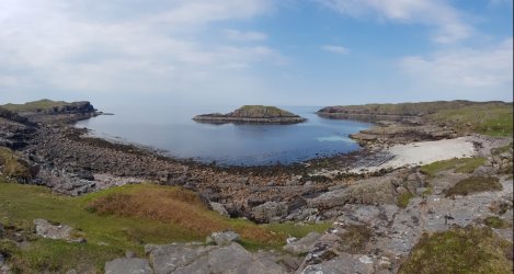 We picked An Stiuir for a first exploration – offering a good mix of grades on mostly south facing crags around 15m high, situated a pleasant mile or so up the coast. The approach takes you around the pretty inlet of Camas Eilean Ghlais, with the crag on the projecting headland beyond.