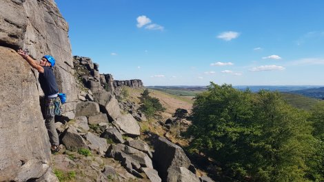 Fresh back from “Rocking Around the World”, this time the less-explored crags and coast of North West Scotland, it’s always a bit tricky to find the motivation to visit more familiar haunts closer to home. The big yellow sun symbol on my numerous weather apps helps fire the enthusiasm and Jim and Dave are recruited for a short afternoon visit to The Peak. Where else but Stanage?