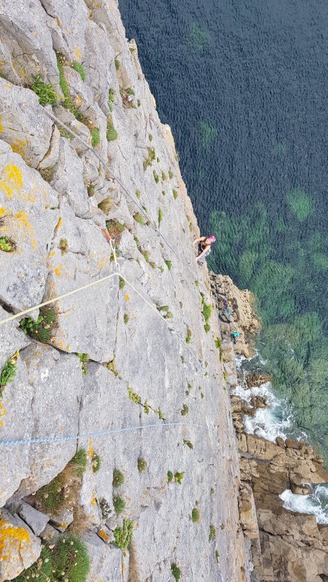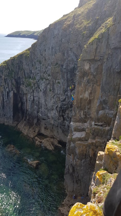 Another favourite spot to avoid bombs and bird bans, so no surprise to find a number of teams with the same idea of a visit to Mother Carey’s. Here’s Helen rapping down Brazen Buttress