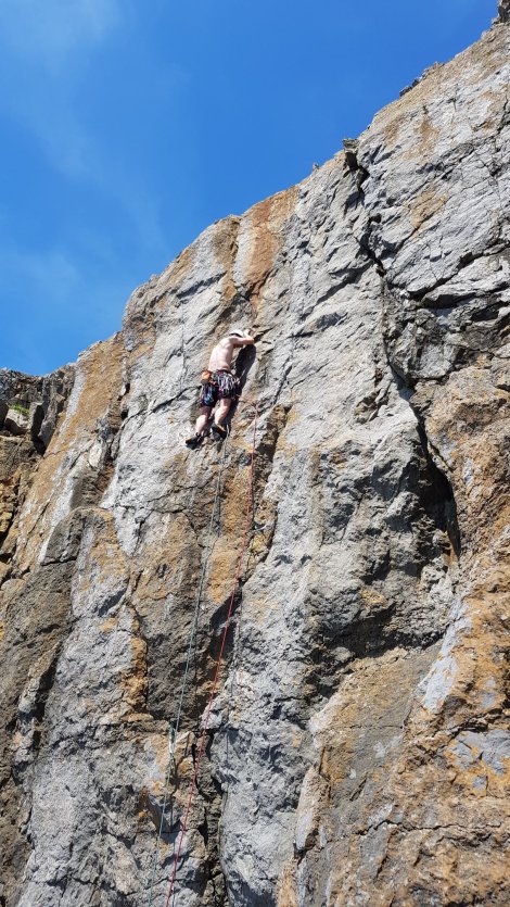 Helen and I started off with Comfortably Numb, HVS, which deserves at least a star or two, then did Whispering Wind, E1 5b which is somewhat more of a struggle (though also very good) and provided a good vantage point to snap James on Lotus Europa