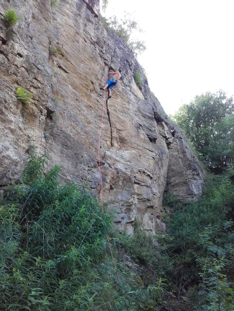 Opposite is a shady wall with just a couple of routes. I did Chossword, 6b, which reflects the current state of the rock, though it offers fun, steep and juggy climbing which might just clean up into a classic. Here’s Helen on the adjacent Happy as Lazarus, 6a+.