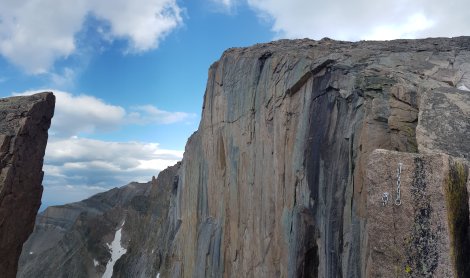 1. As I remember shortly before your rap point down to Broadway is the start of the original ‘tourist’ route up Long’s Peak. I managed to find part of the original via ferrata hawser and then followed the same line up to the top including taking one peek over the edge to the Diamond Face. I came back down the current tourist route and the whole made a great day out. I remember popping over the edge onto the summit plateau much to the surprise of the ten or so people assembled there! Enjoy the holiday. Jim.