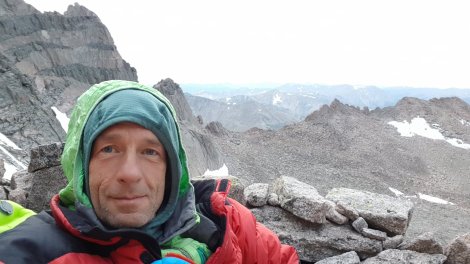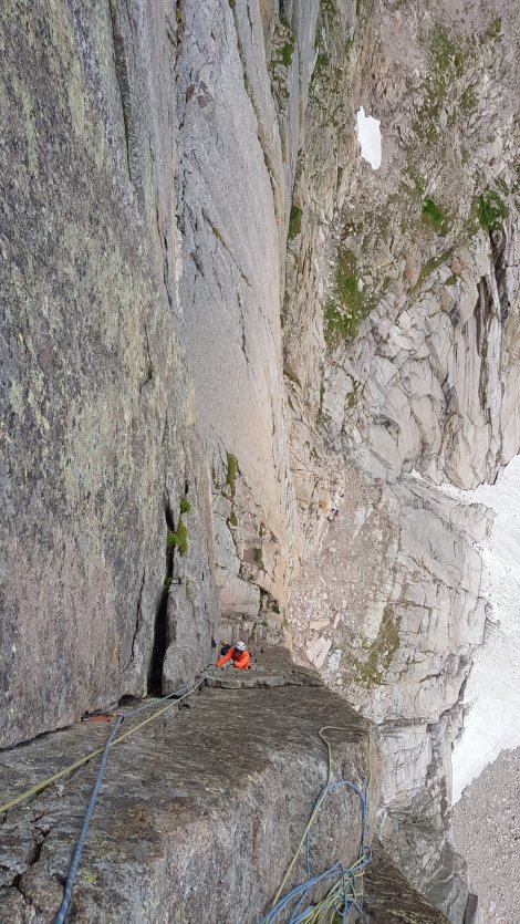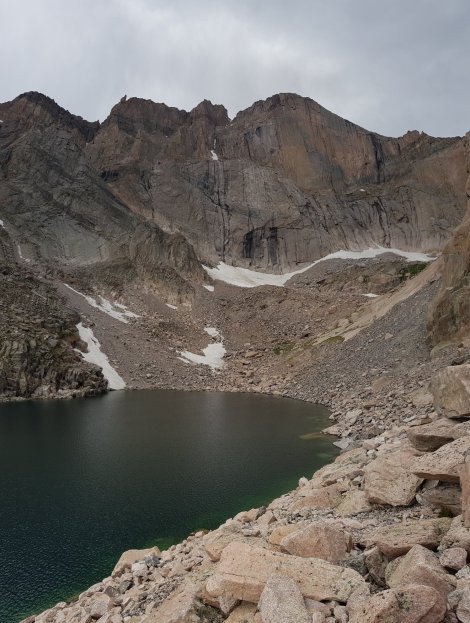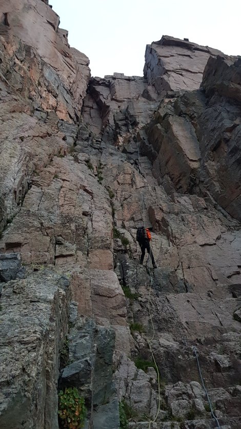Long’s Peak, at 4,340m, is the highest in Rocky Mountain National Park. It’s a shapely enough mountain and draws numerous hikers for the challenging “keyhole route” to its summit, but it is the spectacular sheer cliff on its eastern flank which is the magnet for climbers.Ancient geological forces took a scalpel to the conical peak and cleaved a magnificent 1,000ft high wall – inevitably christened The Diamond and the iconic image of RMNP and of Colorado climbing. I first caught sight of more or less the above view on our family Big Trip about 15 years ago and The Diamond immediately cemented its place on my lifetime To Do list.The Casual Route features in the North America’s 50 greatest climbs and is the “most casual” route up The Diamond. With 8 pitches of HVS to E1 climbing it’s certainly not desperate, but all those pitches lie above or around 4,000m!There are a couple of approaches and numerous strategies to access The Diamond. We chose to walk up to Chasm View and rap down to The Broadway, the ledge the base of the routes (our original plan being to bivvy here). After a quick recce at the NP visitors centre,we set off on our approach. It’s about 7 miles and 1,200m of ascent up a very well made and graded trail – just as well with sacks stuffed full of climbing and bivvy gear.Typical RMNP weather, afternoon clouds building towards likely storms around 4pm – The Diamond becoming visible as we leave the tree line. Sure enough, an impressive electrical storm kicked off “bang” on schedule, but luckily its centre passed a mile or so to our south so we only got damp, not drenched (or fried!)We’d planned to keep weight down by filling a 5 litre container as near to our bivvy as possible, but got increasingly worried that we’d stuffed up and missed the last source. We chatted to a young couple heading down from their hike up the regular route to the summit “You’re going to climb The Diamond – Jeeze!” and they assured us there was running water at The Boulderfield, but offered to fill our drinking bottles from the couple of litres each they were now lugging unnecessarily down the hill – how nice was that!The Boulderfield is a real surprise as you encounter it above the somewhat barren slopes – a near-flat bowl of (you guessed it) boulders with streams trickling through and verdant pools – a sunny Shangri-la at 4,000m and an ideal bivvy spot for those hiking Long’s Peak. Spots are highly sought after and rationed by permit – one couple I spoke to had booked their place in March.Great views across to The Diamond.We filled the water carrier and headed up towards Chasm View, with the altitude and extra weight really making themselves felt for the last few hundred metres of ascent. It was 6pm by the time we reached the Ridge (and rap point) overlooking Chasm Lake and The Diamondand we decided to exercise some good mountaineering judgment and bivvy there rather than make the 3 raps down to spend the night on The Broadway, figuring that a jammed rope this close to sunset could make for a miserable evening.There are a few flat bivvy spots on the north side of the ridge, with the added benefit of catching the last of the rays and enjoying spectacular views down to the Boulderfield – we settled in for what would have been a very comfortable night if it hadn’t been for a mini-disaster – in the final shuttling of loads to the bivvy spot, the water container had slipped out of the top of my sack and split. Swift action saved the last litre or so but left us with only a couple of litres for the evening, breakfast and the route. Time to go into camel-mode…Wrapped up warm, we retired for an early night.Bill sounded the 5am wake up calland a procession of lights was already visible on the hiking route across the Boulderfield below.We were making the first of 3 50m raps by 6am as dawn was approaching, but the magnificent sight of first light on The Diamond was somewhat offset by the pinpricks of torchlight making their way up North Chimney (just about visible in the bottom of the photo above). Looking like we’d have company and most likely be in a queue on The Casual Route.The rap points were pretty easy to find and shiny and new… and the walk across the Broadway straightforward, so we were soon joining the back of the “line” at the foot of The Casual Route.Happily the two teams ahead of us were both friendly and capable, so apart from a delayed departure and the occasional wait at stances we were barely delayed, and the belay banter and conviviality more than made up for this.P1 is a bit of an introductory scramble, and here’s Bill on the thin 5.9 crack on P2 with Rudyard above on the airy 5.7 traverse of P3 and Ryan visible at the far left on the belay at the end of P3Here’s Bill following P3 with the Chasm View rap route in the background.Pitches 4, 5 and 6 follow a long 5.8 corner / dihedral (sustained VS/HVS)Which brings you to the 50m crux pitch 7, which could easily be a 3 pitch classic in its own right. It starts with some great moves up thin parallel 5.9 cracks (here’s Rudyard showing the way)Before a heinous 5.8 squeeze chimney (normally I manage to contrive events so that Bill gets these – I must be going soft!) here he is following…This leads to the 5.10a crux – a bit of a boulder problem which would probably feel easy if it wasn’t at the end of a 50m pitch, after a thousand feet of climbing and well above the 4,000m contour. Stiff pull required to arrive at the belay, where I was greeted with “nice work!” from Ryan.The final pitch traverses left again along the Table Ledge crackTo reach the D7 rap route. This gets you back down to Broadway (and your sacks and bivvy gear in our case) and a further 4 raps take you down to Mills Glacier and the walk off via Chasm Lake. The first rap point is not obvious – follow a zigzag path down beneath the start of The Casual Route to end up at a triple bolt rap station about 100