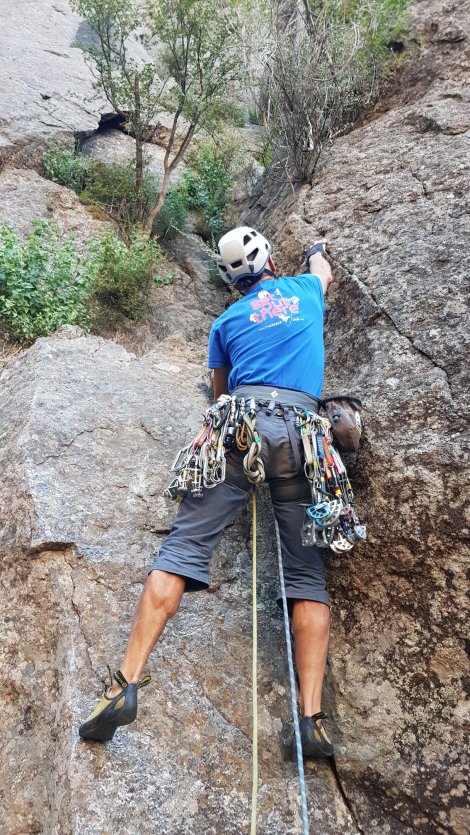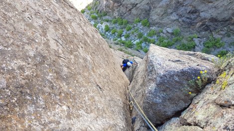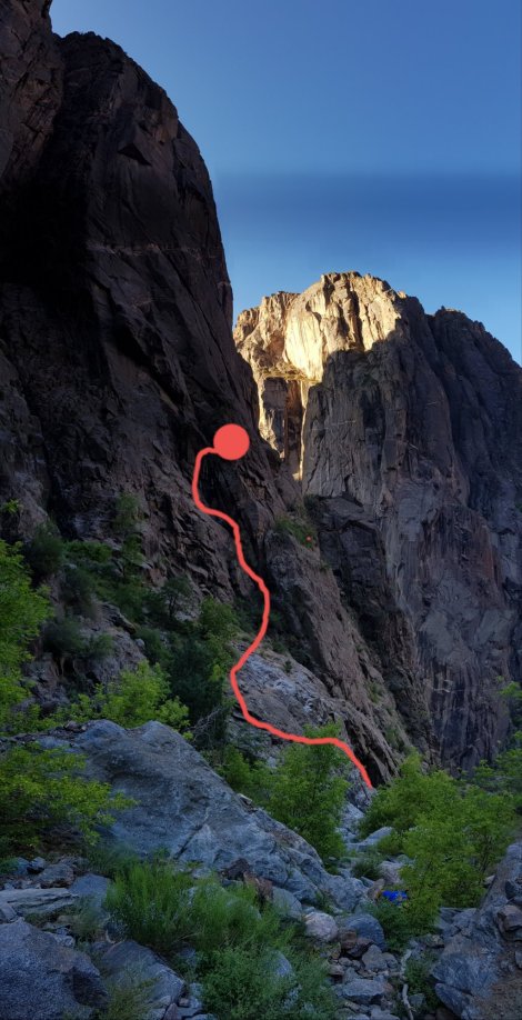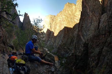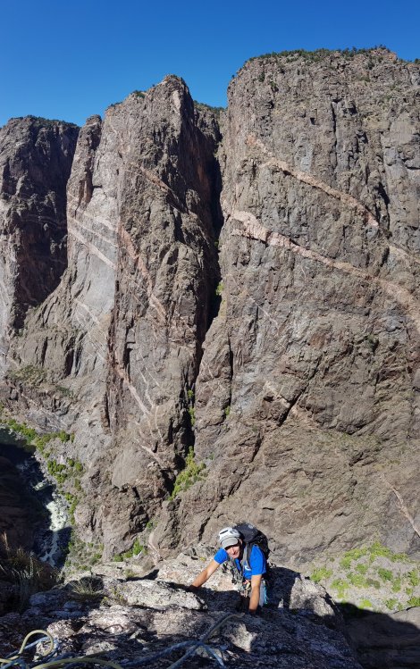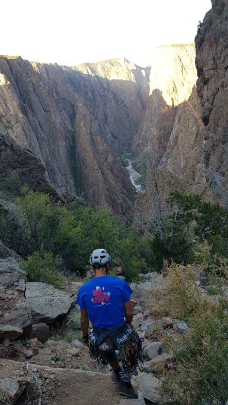 There’s hardly anyone climbing in The Black – we’ve only met two teams in 4 days, both from Ouray and both knew Gary Ryan. It says something about the closeness of the climbing community (or Gary’s fame!). We met Brad and Stuart as they’d just climbed Comic Relief and they recommended it highly, with the “Lightning Bolt Crack” variation – “looks just like London Wall” commented Brad, who’d climbed in The Peak before emigrating. The route is accessed down the SOB Gully and starts closer to the river, taking 10 or so pitches to reach the rim, if you opt for the additional “Exit Route” finish. Another morning shade option made for an earlyish start and we were making our way down the gully at 7.30