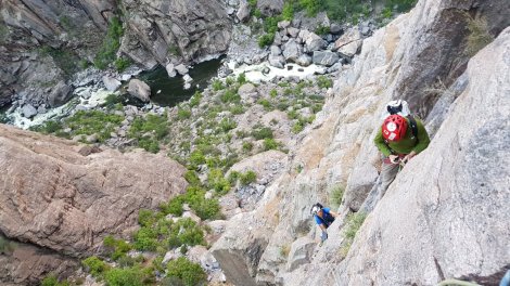 Here’s Charlie on the belay and Bill following the monster first pitch.Here’s Mason leading the 5.10 P2 with a fun pull through the small roof.… and here’s Bill leading the same pitch.Mason and Charlie then made the very generous offer to let us lead through (maybe it was “be nice to old people day” in Colorado?) Anyway, this left me embarking on the crux 5.10c pitch – it’s a huge energy-sapping 60m stretch with a lot of sustained gnarly jamming and more than one tenuous move. I arrived at the belay completely spent, but also very pleased to have got it in the bag. The sun arrived shortly afterwards and it was clear it was going to be a long hot day! Here’s Bill seconding… and Charlie setting off… and gurning his way through the crux.The next pitch is widely held to be “the mental crux”; the dreaded pegmatite traverse. This heads through a band of quartzy rock before a testing swing leftwards onto a flake, with gear some way to one side. No bother for Bill of course.P5 is the final desperate pitch; another 60m rope and sinue-stretching 5.10c monster – fun, steep, crimpy moves off the belay (probably the technical crux) followed by tough crack climbing to a roof. I went left round this (as does much of the chalk) but the guidebook suggests stepping right beneath it – that’s my excuse for grabbing a bit of gear to clip in extremis! Apart from that minor indiscretion, the pitch also saw Bill jettison his phone into the depths of The Black (he’d been taking a photo whilst I was trying to clip some gear, and the rest is history – as are the pics of me on The Lightning Bolt Crack!) I was almost retching with the heat and effort by the time I reached the belay – a commodious ledge that would make a reasonably comfortable bivvy for two. It marks the halfway point of the route – about a thousand feet of climbing done and another thousand to go, but probably the four hardest pitches in the bag. Time for a brief respite to enjoy the view.There’s plenty more work to be done before a beer can be enjoyed, and the 5.8s and 9s aren’t give-aways, especially with the gnawing effects of cumulative tiredness and heat. Here’s Bill on P6Following P7 up a funky flake chimney (with Mason just popping his head into view below)… and bravely setting off on P8: “The second mental crux” which involves an exposed traverse… followed by a really tricky couple of moves up a slabby wall protected by a distant bolt. Good effort! It’s around 3pm by now and the sun has finally come off the wall. I get a grungy short corner with a ridiculously hard move to enter it (5.9 my arse!) and then Bill leads a huge traverse then crack towards the rim.…and a final 5.8 (which still packs a punch!) and you’re topping out into the land of the horizontal, just a few metres from the tourist overlook where we’ve spent the last few evenings, and more importantly only a hundred metres away from the tents and Beers! We nip back to the campsite and bring a twelve-pack plus chips (and some bottles of water!) back to the top-out, to welcome Mason and Charlie to the finish. It turned out to be quite a day for making sacrifices to The Black – as well as Bill’s phone, Mason managed to jettison his backpack and Charlie shed a set of wires! Anyway, the offerings clearly appeased the Canyon as we all survived to tell the tale. Fabulous day out, and it was great to have such good company on such a testing route – team top-out selfie to follow…