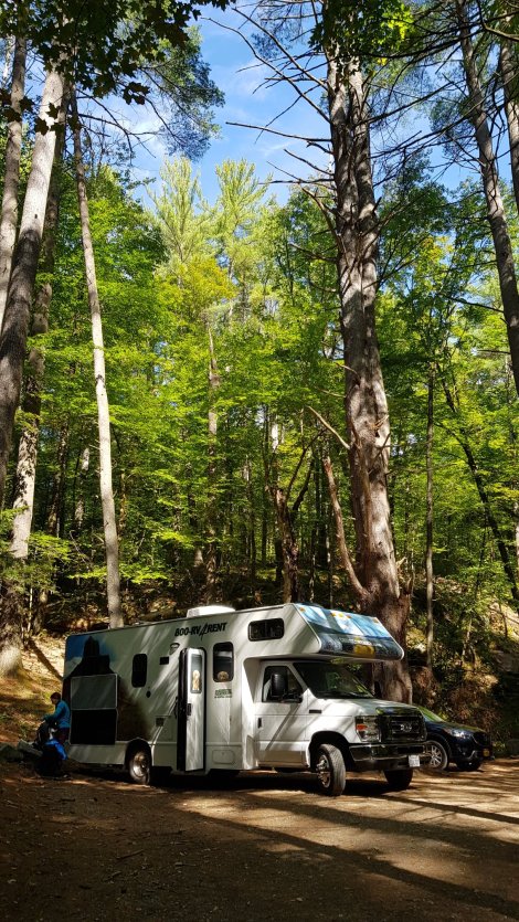 … and contains around 250 climbing areas! Our plan is to just dip our toes to break the journey on our way north, then spend some quality time exploring the area on our way back south. We used Mountain Project (another huge shout out for this amazing free resource and the community who use it!) to identify a candidate for our Daks drive-by: Shelving Rock on the edge of Lake George. It certainly isn’t one of the established classics, being a recently developed partly-sport crag, but it’s barely out of our driving route, has a short approach, and sports routes are handy for a quick fix. Even better, there’s a charming State Park campground: Lake George Battleground.The drive to the parking area is partly on gravel but is in good repair and the 15 miles or so are easily covered in about half an hour – even in a 25ft RV