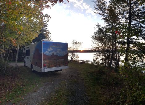 Got your attention there, but I’m afraid there was no actual falling involved. After two weeks of great weather, and 13 days of back-to-back climbing, we had the first really crappy day of our NE America tour. Drizzle mixed with the occasional downpour and chilly temperatures meant a pause in the climbing fun, to be replaced with mooching around Acadia National Park. We moved on to the less-travelled south-western corner and the Seawall campground, which was certainly less frantic than the main honeypot areas, reccied a couple of very wet crags and wandered along a couple of short walks. Sometimes rain is just nature’s way of telling you to have a rest day…. Or two! We set off northwards with a plan to climb on Eagle Bluffs, one of the crags near Clifton, but a quick shuffty indicated that the overnight rain had left the crag pretty damp. Most of the best routes involve steep granite crystal-pulling on cleaned streaks up otherwise lichen-covered walls – not the kind of territory that takes kindly to moisture.Much head-scratching ensued, with a major decision point in our itinerary to be made ahead of schedule: A) Go back west, and start retracing our steps to explore New Hampshire more deeply (seems too soon); B) Head north into Québec (appealing but the forecast isn’t great for the next couple of days); or C) Venture further east to enter Canada in New Brunswick and explore the climbing and coastal scenery there, before looping back. Option C won, and we set off along US Route 1.This starts out branded The Bold Coast, before transitioning into The Down East Byway (not on my map it isn’t) and morphing into the Fundy Coastal Route once over the border – every mile of it lined with trees resplendent in their fall colours. We stopped off completely randomly at the Cobscook Bay State Park, more or less the easternmost point of the USA, and what a happy find it was. There can’t have been more than half a dozen campers on the 150 site campground, so we managed to swag this absolutely idyllic sea-front spot