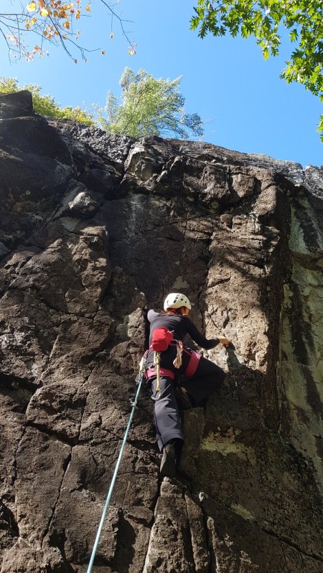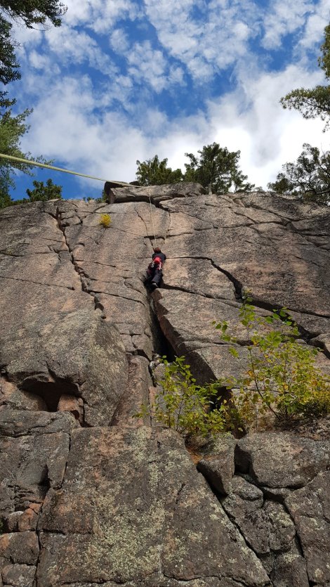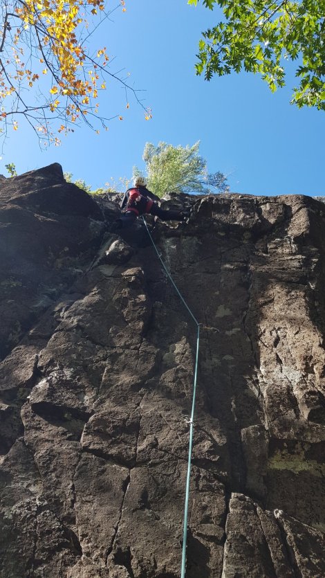 It’s a bolted granite wall of about 60 to 100ft with a good spread of grades.We warmed up on Dying Embers, 5.10a (steep fun)
