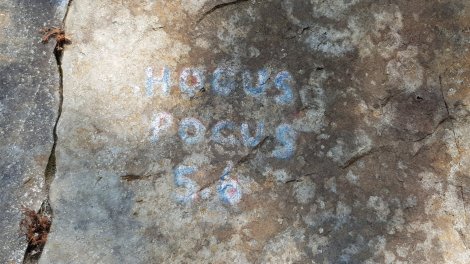 You can just about pick out a couple of sunlit aretes on southwest protruding buttresses, and these both offer excellent warm-ups (literally) to make for on arrival at an otherwise shady crag: Hocus Pocus, 5.6
