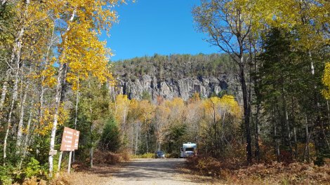 This is the most popular crag in the Lanaudiere region, in rolling forested hills about an hour north of Montreal, and about 3 hours from our last stop at Lac Long. We headed over on Canadian Thanksgiving / Columbus Day, making the most of a crappy forecast for the drive and a catch up with van chores (it’s not all full-time fun you know – there’s recycling, trash and waste water to dump; propane to refill, if you can track it down; and essential provisions to re-stock, eg beer and bananas!)