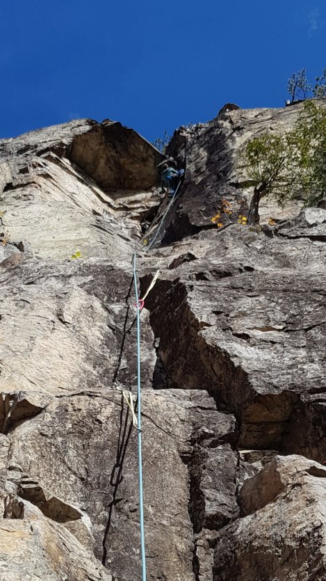 We did three of the “must do classics”, all given 5.10a and 4*s:Denis de l’Évidence (originally 5.9 but apparently a lost hold has upped this to 10a, though we weren’t really sure where). Here’s Helen heading up the initial corner with the crux overlap looming 30m above at the top left of the photo.