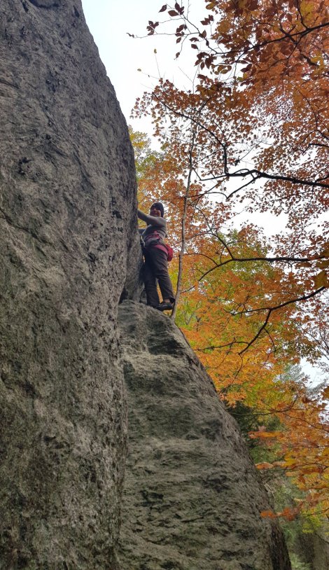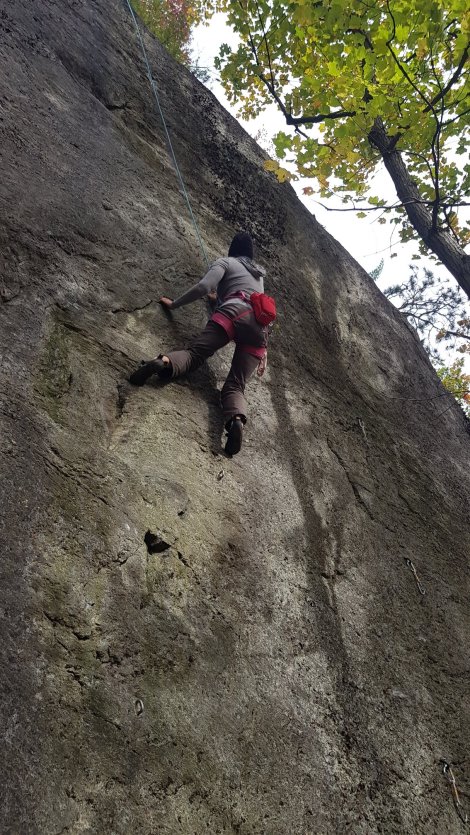 It looks like we’re heading into the weather-dodging phase of our trip, with a 3-day wide band of rain passing through. Our intended next stop in The Dacks looked particularly soggy, but after much scouring of weather and navigation apps we came up with a cunning detour through Vermont. This had a number of benefits: the drive could incorporate the Lake Champlain Scenic Byway, which links a number of islands down the centre of the lake, via bridges and causeways; we’d end up at the charming Little River State Park (one of the few public campgrounds still open); and in between we could notch up a few routes on a day that would have been a washout in The Dacks, and also put a tick in the box: “Climbed in Vermont”.The byway was indeed Scenic, and we were soon arriving in Bolton, just east of Burlington, and perhaps the epicentre of Vermont climbing, with hundreds of routes recorded in the recently published Tough Schist guidebook. There’s clearly a highly active local climbing community, keen to establish Vermont appropriately in the local pecking order, alongside the better known venues of Rumney, Adirondacks, Gunks etc. The rock is predominantly Green Schist and there are a bunch of areas to choose from. We went for Bolton Dome, at least in part because we were impressed with the story of how the locals, in the guise of Crag-VT had recently negotiated the purchase and reopening of this historic venue after it being out-of-bounds for 20 years. It’s also a very handy 5mins walk from the parking lot they also negotiated
