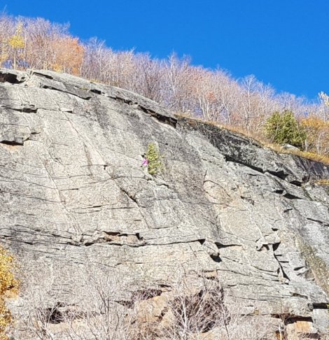 Pitchoff Chimney Cliff looked like a good option – roadside, South (or at least SE) facing, and well clear of the trees to allow the rock the chance to dry.
