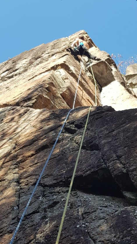 This is bounded on the left by the stunning arete of Esthesia, 10a, easier for the the most part until the obvious off-width overlap near the top, which proves to be a real struggle. Camalot #4 handy (first time used on the trip but worth it’s dent on the baggage allowance!)