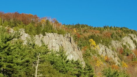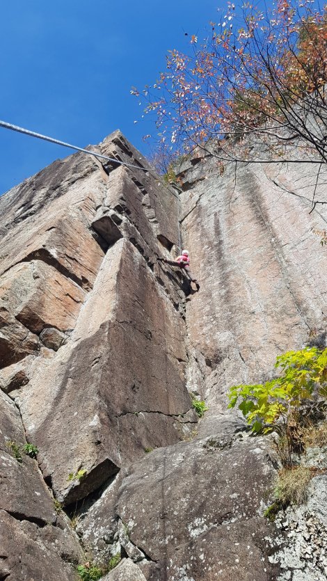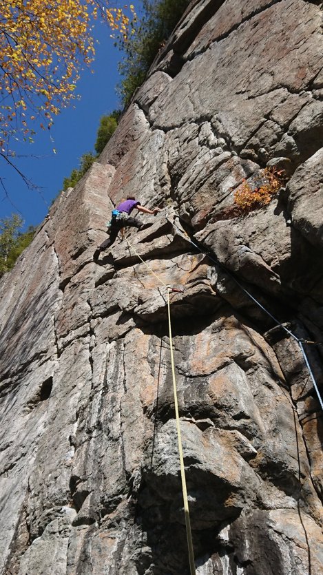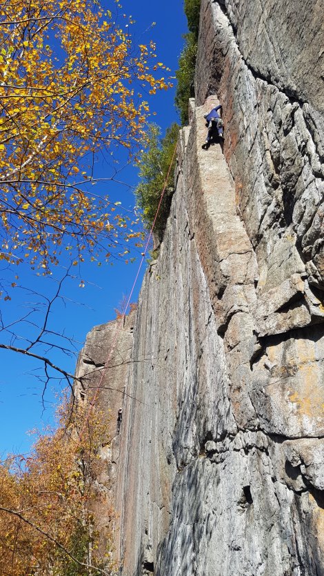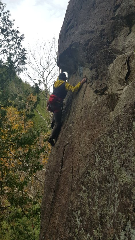Our 3-day weather “window” in The Dacks turned out to be more like a couple of arrow-slits. After glorious weather on Saturday, Sunday was grey and chilly. Unfortunately this coincided with the only day that Ben (newly arrived on a lengthy work secondment in NY state) could make it over to join us. Unperturbed, we parked up near Chapel Pond (perhaps the centre of gravity of Dacks climbing?) and walked into Beer Walls. This easily accessed crag is parallel to the main Keene Valley Route 73 but hidden from it on the back of a low ridge – it has a reputation for being very busy, but we had it completely to ourselves (obviously the only people daft enough!)The trail is pretty obvious, with wooden steps to start with, and passing by a sign-in box, then leading over the ridge to the top of the crag then down to the left hand end of the Upper Wall in about 10 minutes. We wandered along beneath this, past a few wet and polished cracks, until we found ourselves at the foot of a striking arete, split by a shallow corner. Some Mountain Project browsing led us to the conclusion that this was Frosted Mug, “along with Slim Pickins, one of the two best 5.9s in the Keene Valley” and solid 4*. They weren’t wrong – excellent, fun climbing and quite sustained at the grade. Here’s Helen making the precarious moves out on to the arete.