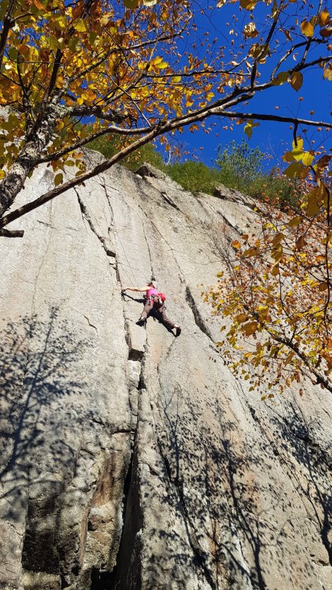 It’s a short approach, but awkward, through a steep talus / boulder field (there’s a GPS track to follow on MP), but well worth the effort to reach this 100ft wall of plonk-on vertical to gently overhanging granite. Mountain Project sums it up with… “The Web is a magical place with splitter lines on some of the best rock in the North East.”Arriving at the base of the crag we found a team from New Hampshire warming up on Mr Roger’s Neighbourhood, 5.8, which takes the slim corner in the shot below, and a couple of locals on Slim Pickins up the major corner in the background.