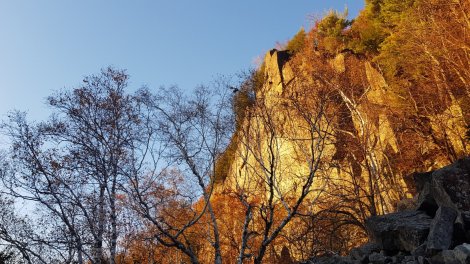 Gorgeous evening light on the crag as we stumble down through the now-shady boulder field.