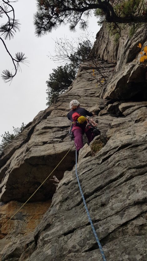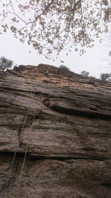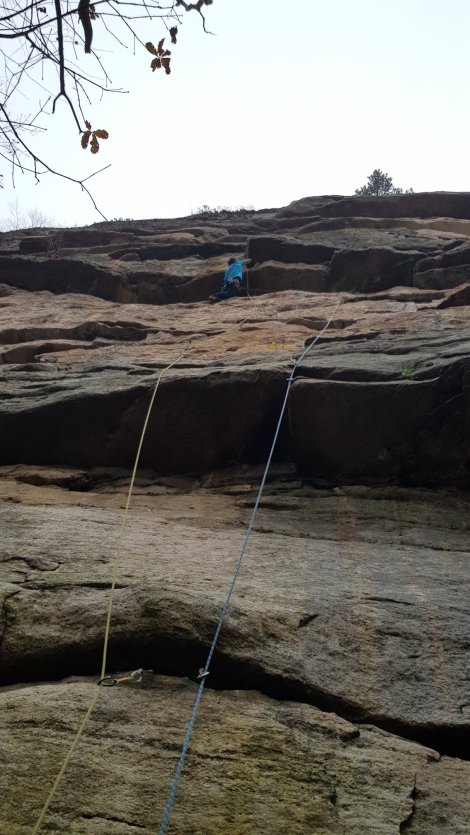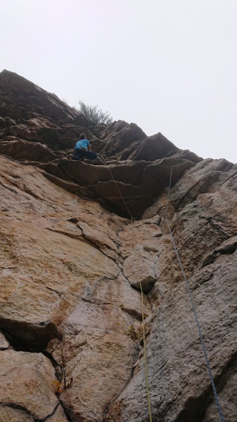 We warmed up on Three Doves, 5.8+ and adjacent to The Arrow and Annie Oh!, and similar in style – quite spicy in the damp conditions and FYI you can’t run the two pitches together with double 60m ropes!