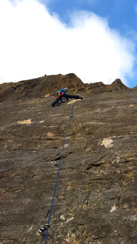 Anyway, even amidst the damp and gloom, the British weather will sometimes throw you a scrap of a reprieve, and the trick is to make the most of it. Sunday dawned bright and despite a forecast of max 8C we made a dash for a bit of dry, sunny, sheltered rock. Moss Rake got the vote. We’d reccied this new venue earlier in the year and added it to the “winter suntraps” list