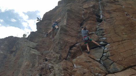 Two further routes just left were also heavily chalked, with Tash and Jake drawing a handicap speed-climbing comp on La Visionarie, 6a, and Hotel Andorina, 7a respectively.