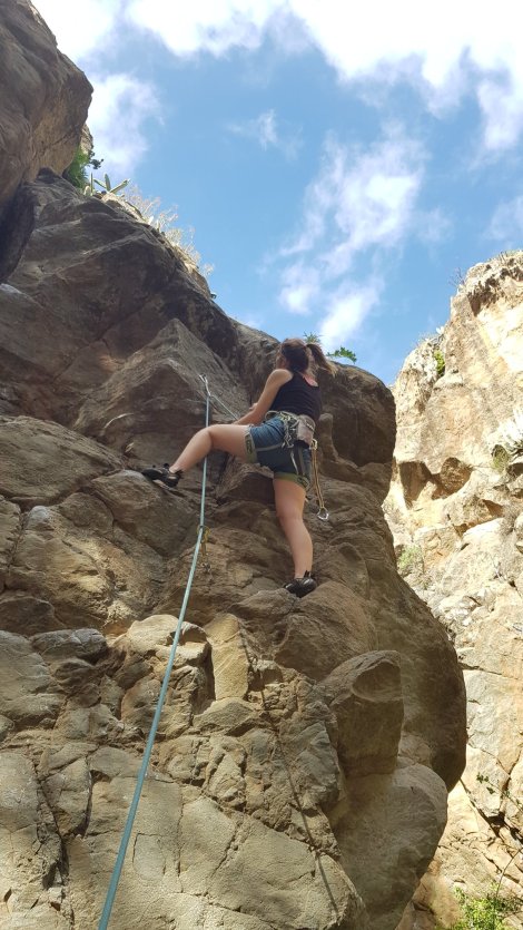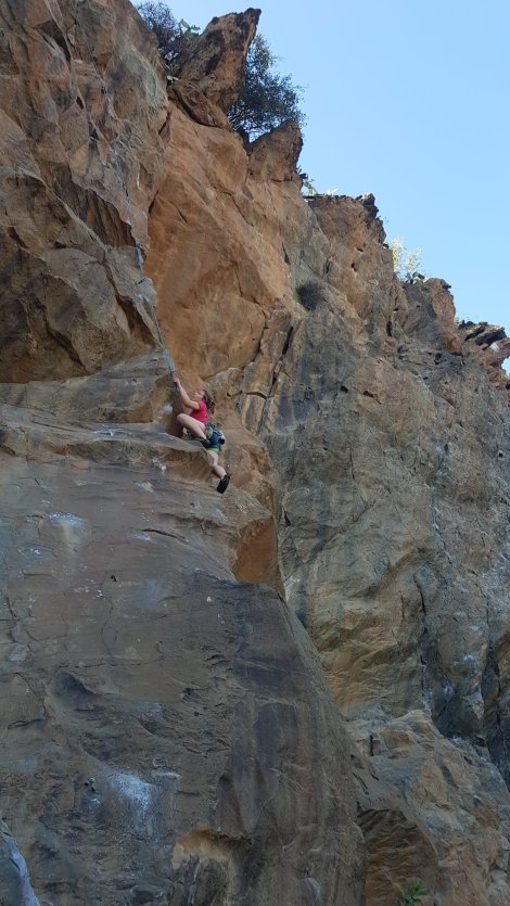 Tash and Leah both took advantage of a couple of easier bolt lines (many of the Vs have been left as trad lines throughout the island) for some leading – here’s Tash on La Morrallosa
