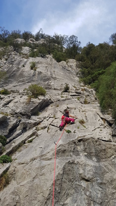 We started off on the crags to the left / west of the parking, which are slabby to vertical white limestone covered in flakes and goutes d’eau – you could be in Provence, if it weren’t for the absence of polish (okay, much polish). Sector Camino is easily accessed in a few minutes stroll down an ancient cobbled track and catches all the rays going – a real suntrap!