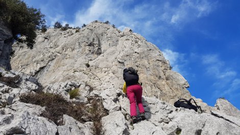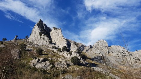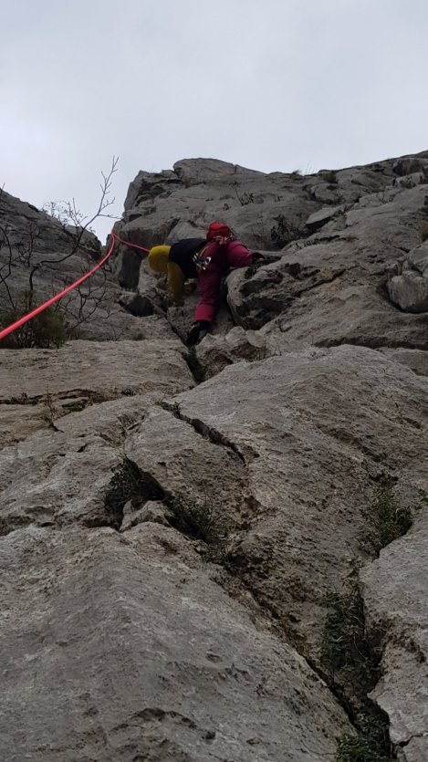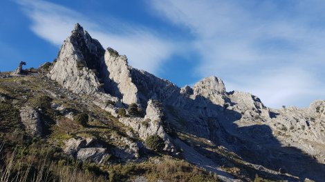 Another gorgeous day, but don’t be fooled by the blue skies and sunshine – the wind was absolutely bitter. Nonetheless, we made our way up to Urrekoeatxa – it’s the steep “tilted tombstone” to the right of and slightly behind the pointy skyline in the pic above. You approach by following the GR path for 100m then branching right up a narrow steep path which zigzags left of the lower pinnacle before finding a way beneath the base of the upper pinnacle and over a rocky coll to the foot of the routes.