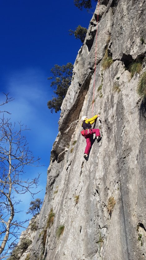 We chose another decent looking line but our hosts dashed over to say there were far better routes, and pointed us at a 30m 6a on the crag to the left – amazing holes / holds and a classic “rock-over with your foot in the only pocket which is also your handhold” move.