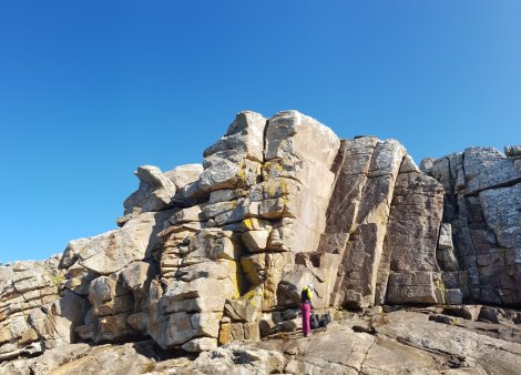 Anyway, enough of the history lesson. You park in the same place to reach the crag, and follow signs to the Fort along a cobbled track with red and blue paint flashes. As the fort comes into view, ignore the throngs heading towards it and instead stick with the track and flashes and bear right following a walled sunken track down towards the sea. This soon brings the crag into view: