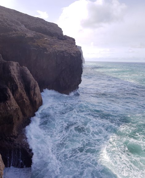 As Jim and I were carefully flaking ropes a few minutes later, a freak wave snuck round the other side of the island (no doubt the fault of a butterfly’s wing flap on the other side of the ocean) and broke about 5m above our heads! I got a good splashing and the crag was now significantly damper. Time to get out of here…