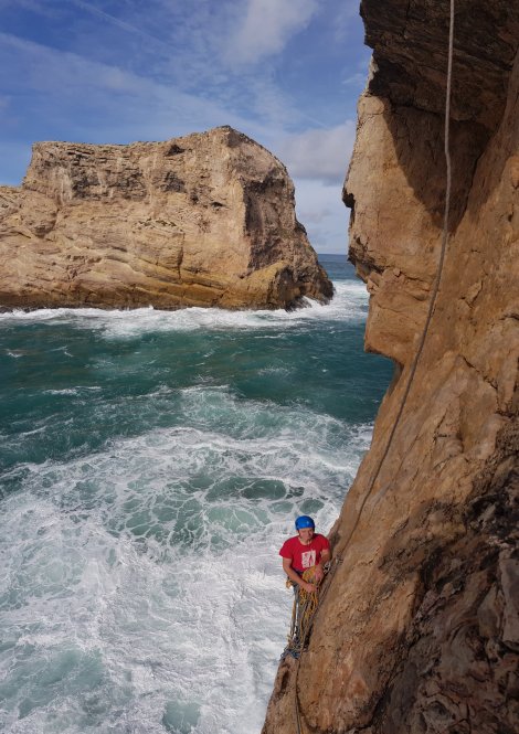 It sits opposite the island of Pedra das Gavotas, which you might imagine would provide some shelter from the Atlantic rollers, but actually seems to funnel them into greater fury, as we discovered! Here are the GPS coordinates for the rap point (a couple of very nice shiny bolts next to a rusted bit of chain which serves as a reminder to chip into the bolt fund!