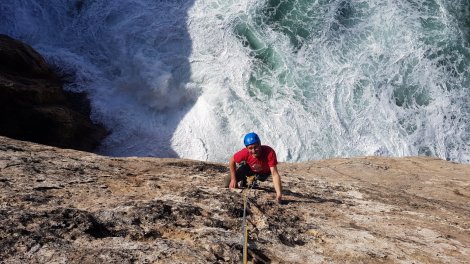 Back down for Silent Running, 6b, with the arrival of the sun making for a much more comfortable belay and prompting a cheerful selfie (albeit with one eye on the lookout for the next big wave!)