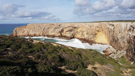 Great views of the big rollers crashing into the zawn that contains the Armacao Nova crags.