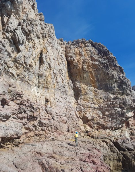 Having been fried (or perhaps broiled) and feeling a little circumspect about the trad grades (there are no descriptions in the guide, and some of the routes clearly rely on the occasional bolt, now long disintegrated) we moved venue by a few hundred metres to The New Redoubt N36.995035, W8.950335. A couple of shiny titanium glue-ins mark the abseil line down the fine open corner / groove of the well-named Gentle, V+,