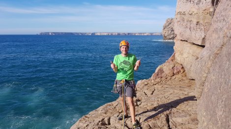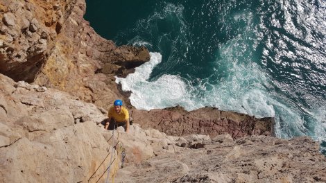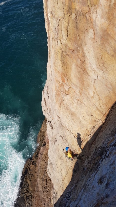 We headed for the Pleasure Ledge sector, which looked to catch the sun (it certainly did!) and have a ledge at the bottom (two out of two!). It’s fairly easily identified by the huge square-cut corner where the path to the lighthouse meets the coast. Here are the GPS coordinates N36.993804, W8.9497445. Look carefully and you’ll find a titanium bolt and chain for a rap point.