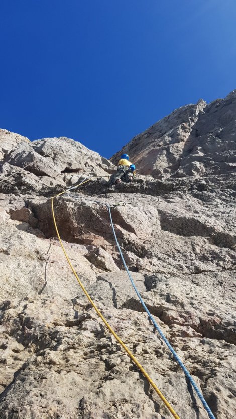 Spurred on by that more ‘Gentle’ experience we rapped back down to the commodious belay ledge (you’d just get down on the stretch of one generous 60m doubled) …
