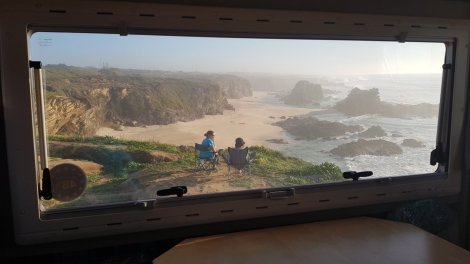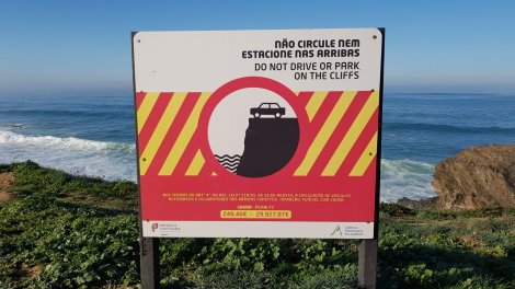Onwards to an absolutely spectacular van parking spot, perched on the cliff tops above Praia da Samoqueira beach. The authorities seem to be a little concerned about the stability of the cliffs…