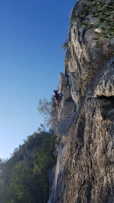 We did a couple of the longest routes on sector Iliada and Odesseia, both two pitches 6as (though we ran them together and got down comfortably with an 80m rope – 70m would probably do at a stretch) and both good climbing.