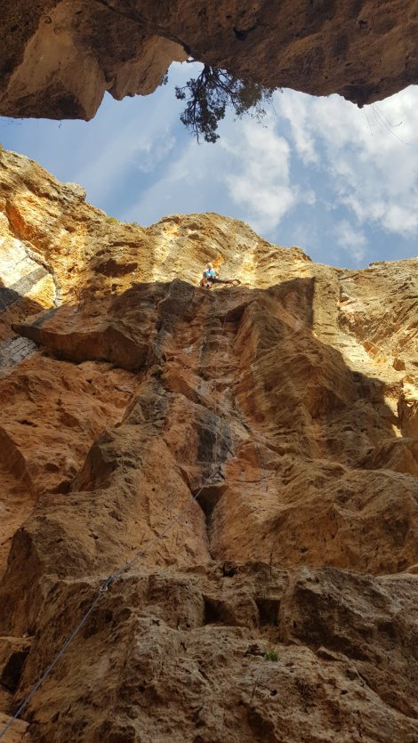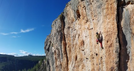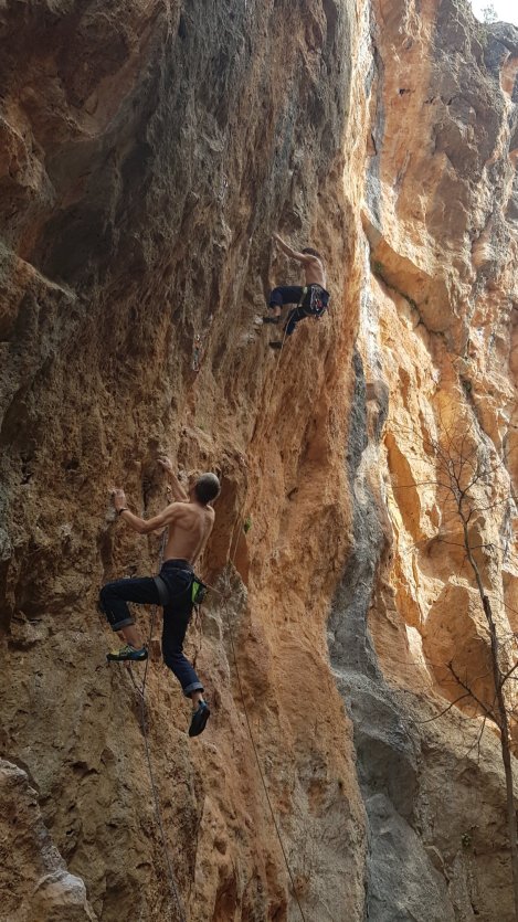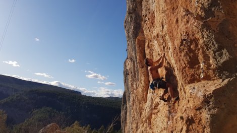 The top of the canyon immediately opposite the campsite is home to the biggest sunny sector, Casucho, which stretches for about a kilometer of sun-kissed southsouthwest-facing limestone (the photo’s a bit of a cheat as it was actually taken around 6.30pm). There are over a hundred routes spread over numerous sectors and we explored most of it over the course of a couple of days.