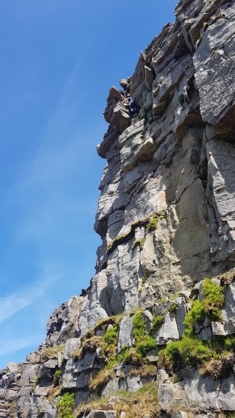 The guys are soon up and off, so it’s our turn. Somewhat blocky rock at the base leads to more solid and sustained territory with a tricky move to enter a lay back crack. The Direct joggles rightwards beneath a significant overhang to finish fairly straightforwardly up a broken corner.
