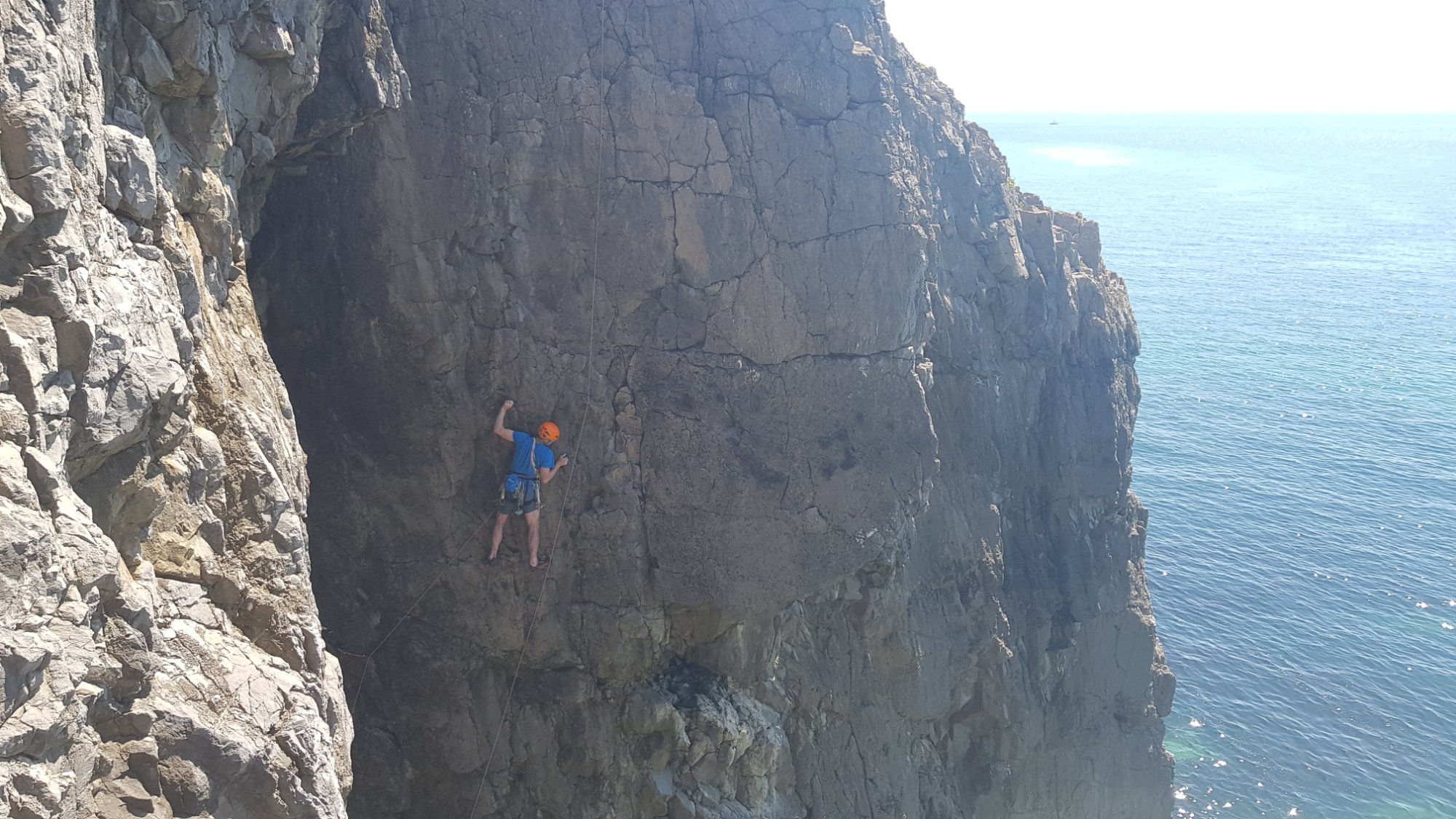 Helen and I rapped down the opposite side of the zawn, through seriously overhanging terrain, with increasing disbelief that we’d find a HVS exit via Goodge Street. This also gave great views across to Mark engaged in battle with a somewhat sopping Splendour