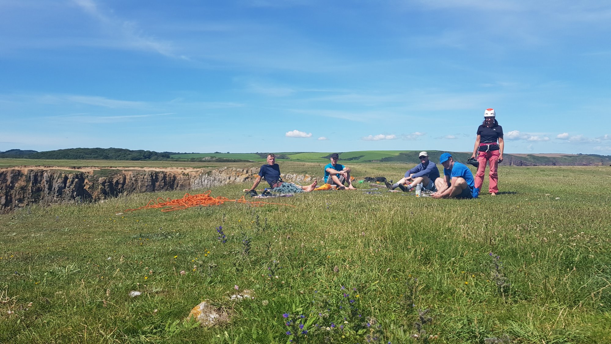 As well as this patient heron, we also spotted a Mexican standoff between a wiley fox and a nonchalant magpie.Chance Encounter zawn is well hidden, a few hundred metres west of Ramming Hole, but we spotted Mark and Graham setting up their ab in to Splendour, E3, highly recommended by our local aficionado, Charlie. “Fancy meeting you here!”
