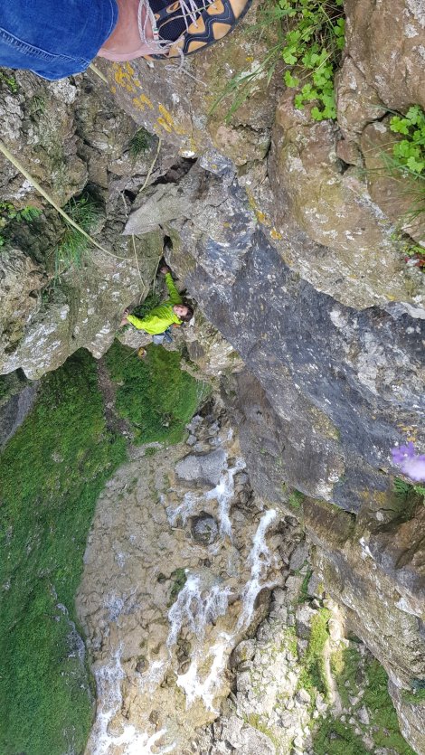 Deliverance, on the other hand, is a genuine quality route. At E5 6b (that’s Yorkshire E5 mind) it’s a bit out of my pay grade, so it was good to take advantage of the rope gun Birthday treat. Precarious moves off the deck soon yield good gear, and a stiff pull brings you to a traverse rightwards onto a ledge. It’s a comfortable spot, and you can just about engineer a sit down, which is just as well as the next moves are utterly perplexing. Tiny crimps and very poor footholds enable a poor layaway flake to be reached and a further long throw is needed to hit a decent hold above the steepening. There is then a classic belay ledge from which to admire the surroundings and the droves of tourists making the pilgrimage to the foot of the falls.