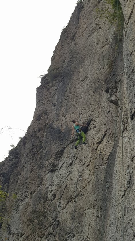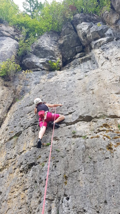 We worked our way through the three routes on the left wall. Dolomitweg, 6, looks a little scrappy from below, and the profusion of tatty slings and ancient pegs don’t inspire total confidence, but it turns out to be an excellent route – the best I’d done in the Frankenjura until we stepped right for Schaumschlager, 7-, which is even better!