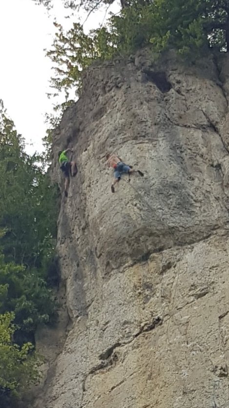 The two tallest walls are split by a somewhat vegetated groove line. The wall on the left is plumb vertical and home to the outstanding Schaumschlager (you can just about make out a climber contemplating the half-height crux pull over an overlap) whereas the bulging right wall hosts a string of stunning 8s and 9s. Here’s a closeup of a couple of climbers battling through the upper bulge with almost 40m of fatigue already in their arms.